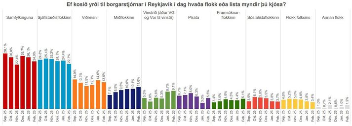 Könnunin var lögð fyrir Þjóðgátt Maskínu, sem er þjóðhópur fólks sem dreginn er með tilviljun úr Þjóðskrá, á netinu. Svarendur eru 18 ára og eldri með búsetu í Reykjavík. Könnunin fór fram 1. til 27. febrúar 2026 og voru 1.015 svarendur sem tóku afstöðu til flokks. Samfylking mælist með 24 prósent, Sjálfstæðisflokkur 22,7 prósent, Viðreisn 13,5 prósent, Miðflokkurinn 11 prósent, Vinstrið 9,1 prósent, Píratar 5,5 prósent, Framsóknarflokkurinn 5,1 prósent, Sósíalistaflokkurinn 3,7 prósent, Flokkur fólksins 3,4 prósent og Okkar borg 1,2 prósent. Borgarviti Maskínu var síðast birtur í lok nóvember í fyrra. Þá mældist Sjálfstæðisflokkurinn stærstur með 25,2 prósenta fylgi og Samfylking næststærst með 22,4 prósenta fylgi. Hér að neðan má sjá þróun mælds fylgis í Borgarvitanum síðustu mánuði: