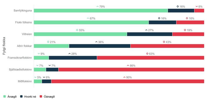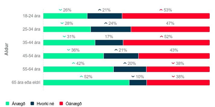Karlmenn eru marktækt óánægðari með störf ríkisstjórnarinnar en konur en ekki er marktækur munur eftir búsetu þátttakenda. Þau sem eru hvað óánægðust er fólk á aldrinum átján til 24 ára og 35 til 44 ára en yfir helmingur telur ríkisstjórnina ekki hafa staðið sig. Það er einungis í aldurshópnum 65 ára og eldri þar sem meira en helmingur er ánægður með stjórnina. Stuðningur við ríkisstjórnina eftir aldri.Prósent Níutíu prósent kjósenda Miðflokksins eru óánægðir en 79 prósent kjósenda Samfylkingarinnar eru ánægðir. Stuðningur ríkisstjórnarinnar eftir flokkum.Prósent Í síðustu skoðanakönnun, sem birt var í byrjun október, hafði ánægja með störf ríkisstjórnarinnar ekki verið meiri í á fimmta ár. Þá voru 48 prósent ánægð með ríkisstjórn Kristrúnar Frostadóttur en þeim hefur fækkað um tæplega tíu prósent. Könnunin var framkvæmd dagana 29. janúar til 16. febrúar.