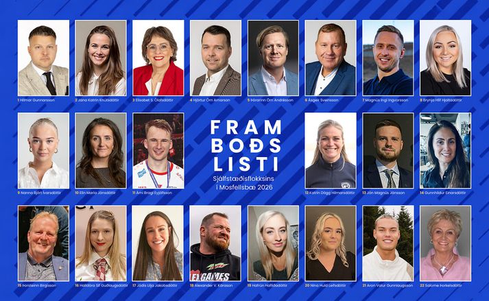 Þetta kemur fram í tilkynningu frá Sjálfstæðisflokknum í Mosfellsbæ, en fulltrúaráð flokksins í sveitarfélaginu samþykkti listann í gærkvöldi, en hann má sjá í heild sinni hér neðar í fréttinni. „Listinn er skipaður öflugum einstaklingum með fjölbreytta reynslu og á öllum aldri þar sem yngsti frambjóðandinn er 19 ára og sá elsti 98 ára. Þar fer saman fólk með ólíkan bakgrunn en sameiginlega sýn um að varðveita þann einstaka anda sem fylgt hefur bænum í gegnum tíðina og einlægan vilja til að gera gott samfélag enn betra.” segir í tilkynningu frá fulltrúaráðinu. Þau skipa lista Sjálfstæðisflokksins í Mosfellsbæ í kosningunum í vor.Aðsend Hilmar Gunnarsson oddviti segir það heiður að leiða hópinn inn í kosningabaráttuna að því er haft er eftir honum í tilkynningunni. „Ég er bæði gríðarlega þakklátur fyrir það traust sem okkur er sýnt og virkilega stoltur af þessum hópi. Hér eru einstaklingar sem þekkja Mosfellsbæ vel, sem búa hér með fjölskyldum sínum, starfa í bænum og taka virkan þátt í samfélaginu. Á listanum erum við með bónda, partývél, heiðursborgara, klæðskera, sáttamiðlara og bara alla flóruna, svo það eru allar líkur á að það verði gaman hjá okkur næstu vikurnar,” er haft eftir Hilmari. „Ég hlakka til að hitta bæjarbúa, heyra hvað brennur á fólki og ræða framtíð Mosfellsbæjar. Við erum með skýrt markmið, það er gott að búa í bænum og þannig viljum við hafa það áfram. Við viljum leggja okkar af mörkum fyrir heimabæinn og halda áfram að byggja hér upp gott samfélag þar sem allt í senn fjölskyldur, atvinnulíf og menning fá að blómstra. Nú verður fjör.” Listann í heild má finna hér að neðan: 1. Hilmar Gunnarsson - Ritstjóri og Mosfellingur 2. Jana Katrín Knútsdóttir - Bæjarfulltrúi og hjúkrunarfræðingur 3. Elísabet S. Ólafsdóttir - Sáttamiðlari 4. Hjörtur Örn Arnarson - Landfræðingur 5. Þórarinn Örn Andrésson - Framkvæmdastjóri 6. Ásgeir Sveinsson - Bæjarfulltrúi og framkvæmdastjóri 7. Magnús Ingi Ingvarsson - Framkvæmdastjóri 8. Brynja Hlíf Hjaltadóttir - Lögmaður 9. Nanna Björt Ívarsdóttir - Laganemi 10. Elín María Jónsdóttir - Húsmóðir 11. Árni Bragi Eyjólfsson - Rekstrarstjóri 12. Katrín Dögg Hilmarsdóttir - Golfkennari 13. Jón Magnús Jónsson - Bóndi 14. Gunnhildur Einarsdóttir - Íþróttafræðingur og flugfreyja 15. Þorsteinn Birgisson - Formaður Félags aldraðra í Mosfellsbæ 16. Halldóra Sif Guðlaugsdóttir - Fatahönnuður og klæðskeri 17. Jódís Lilja Jakobsdóttir - Kennari 18. Alexander V. Kárason - Frumkvöðull 19. Hafrún Hafliðadóttir - Kennari 20. Nína Huld Leifsdóttir - Hárgreiðslumeistari 21. Aron Valur Gunnlaugsson - Athafnamaður 22. Salome Þorkelsdóttir - Heiðursborgari
