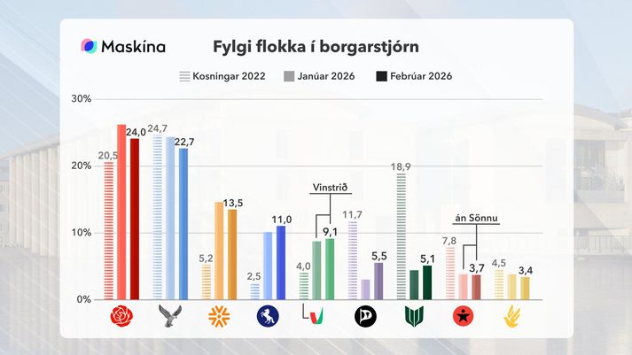 „Þetta verða mjög spennandi kosningar,“ segir Ólafur sem rýndi í niðurstöður nýrrar könnunar Maskínu í beinni útsendingu í kvöldfréttum Sýnar. Mesta spennan verði að sjá, þegar kosningaúrslitin liggja fyrir, hvaða flokkum tekst að mynda meirihluta. Væri afrek að ná í 30% atkvæða Könnunin var gerð í febrúar, eftir að fyrir lá að Pétur Marteinsson og Hildur Björnsdóttir muni leiða flokkana. Ólafur segist ekkert geta fullyrt um það hvort Pétur höfði jafnvel til meira til hægrisinnaðra jafnaðarmanna en til dæmis Heiða Björg Hilmisdóttir og Dagur B. Eggertsson, líkt og einhverjir hafa velt vöngum yfir. „Ég hef ekki séð nein gögn sem benda til þess. Undanfarið hefur það verið þannig að það er mjög lítið fylgi sem að streymir á milli Samfylkingarinnar og Sjálfstæðisflokksins, þannig ef það gerðist núna þá væri það nýtt,“ segir Ólafur. Flokkarnir tveir séu turnar í þeim skilningi að þeir mælast langstærstir í könnunum, en aftur á móti mælist þeir báðir með innan við fjórðung af fylginu. „Í Gallup-könnunum nýlega var Sjálfstæðisflokkurinn að mælast með yfir 30% og Samfylkingin líka stærri heldur en í þessari könnun. En þegar við lítum á þetta nýja flokkalandslag á Íslandi, núna sjáum við til dæmis að það eru átta flokkar sem kæmust inn í borgarstjórnina miðað við þessa könnun og sá níundi, hann vantar mjög lítið. Þannig það að komast yfir 30% í þessu nýja landslægi það væri mikið afrek, hvort heldur væri hjá Samfylkingunni eða Sjálfstæðisflokknum,“ segir Ólafur. „Það yrði gríðarlegur kosningasigur.“ Miðflokkurinn gæti átt inni en Framsókn „að hrynja“ En það er fleira forvitnilegt í könnuninni séu niðurstöðurnar bornar saman við úrslit síðustu borgarstjórnarkosninga. Nokkrar breytingar er til að mynda að sjá á fylgi Viðreisnar og Miðflokksins, en fylgi Miðflokksins hefur aukist talsvert á landsvísu. Gæti það verið til marks um að hann bæti við sig í borginni? „Hann var náttúrlega með nánast ekkert fylgi 2022, hann er ennþá ekki nema hálfdrættingur í borginni á við það sem hann er á landsvísu. Nú er það reyndar þannig að það er ekki alltaf fullt samræmi milli þess hvað gerist í borginni og hvað gerist í landinu, en miðað við þær tölur þá gæti hann átt eitthvað inni,“ segir Ólafur. Könnun Maskínu fór fram dagana 1. til 27. febrúar 2026 og voru 1.015 svarendur sem tóku afstöðu til flokks.Vísir/Maskína Á sama tíma sé Framsókn „að hrynja“ að sögn Ólafs, en flokkurinn hefur tapað um 75% fylgisins sem hann fékk í síðustu kosningum. „En það er ekkert nýtt og Viðreisn er í rauninni að koma mjög vel út. Miðað við síðustu kosningar þá er Viðreisn hátt í að þrefalda fylgið,“ segir Ólafur þegar hann rýnir í niðurstöður könnunarinnar og ber saman við útkomuna úr kosningunum 2022. Góður árangur hjá Vinstrinu Þá gæti verið tilefni fyrir Vinstrið, nýtt sameiginlegt framboð VG og Vors til vinstri, til að fagna. „Miðað við þetta væru þau með tvo fulltrúa, það vantar ekkert mikið í þriðja fulltrúann þess vegna, það er frekar knappt. En ég held að þetta sé mjög góður árangur hjá Vinstrinu. Í síðustu kosningum var VG með 4% og Sósíalistaflokkurinn undir forystu Sönnu var með 7,7 eða 7,8%, samanlagt eru það tæp 12%. Núna eru þeir að mælast með um 9%, þeir virðast vera að fá meginpartinn af fylginu,“ segir Ólafur. „Það verður mjög fróðlegt að sjá hvort að Vinstrinu takist að höggva eitthvað meira í fylgi Sósíalistanna eins og það mælist núna, og kannski líka Samfylkingarinnar.“