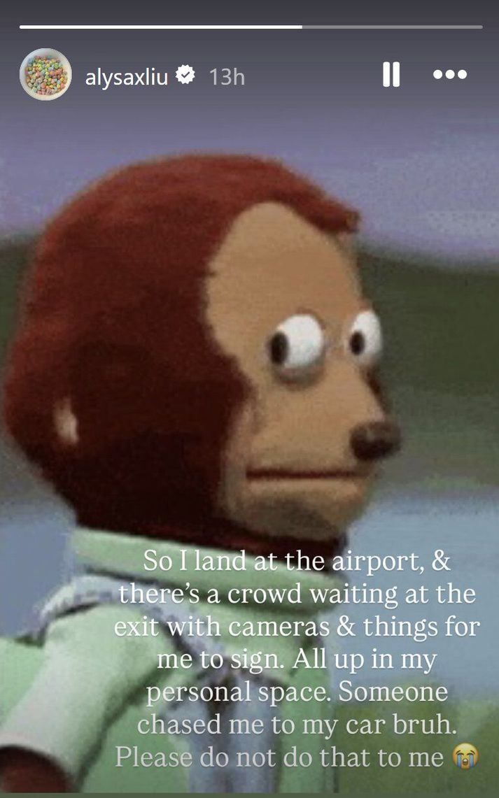 Hin tvítuga Liu greindi frá því í Instagram Story að hópur æstra aðdáenda hefði setið fyrir henni á flugvelli, með myndavélar og gripi sem þeir vildu að hún áritaði, og ruðst inn á „hennar persónulega svæði“. Þá gekk einn aðdáandi svo langt að elta hana alveg upp að bílnum hennar og ljóst að skautadrottningunni þótti þetta ansi óþægilegt. „Vinsamlegast ekki gera mér þetta,“ skrifaði hún og bætti við hágrátandi lyndistákni. Alysa Liu birti þessi skrif á Instagram og varð greinilega ekki um sel á flugvellinum.Skjáskot/@alysaxliu Liu er frá Kaliforníu en var í New York fyrr í þessari viku þar sem hún kom meðal annars fram í Today Show og The Tonight Show með Jimmy Fallon. Hún varð stórstjarna í Bandaríkjunum með árangri sínum á Vetrarólympíuleikunum í síðasta mánuði því þar varð hún fyrsta Bandaríkjakonan í 24 ár til þess að vinna gull í einstaklingsgrein á listskautum, auk þess að hjálpa Bandaríkjunum að vinna liðakeppnina.