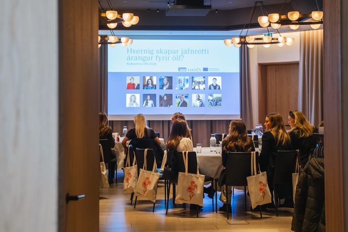 Dagskráin samanstóð af fjölbreyttum erindum sem svöruðu spurningunni út frá mismunandi hliðum sem tengdust bakgrunni og reynslu fyrirlesara. Svo var stiginn trylltur dans við grípandi tóna Reykjavíkurdætra. Hér má sjá vel valdar myndir af þessari valdeflandi stund: Jóhanna Birna Bjartmarsdóttir hélt erindið Algild hönnun – grundvöllur jafnréttis í námi og starfi.Aðsend Amna Hase.Aðsend Vinkonur á ráðstefnunni.Aðsend Stjórn UAK í skýjunum með daginn.Aðsend Glæsileg stjórn Ungra athafnakvenna. Stjórnina skipa Melkorka Mist Gunnarsdóttir (formaður), Athena Neve Leex (varaformaður), Alma Stefánsdóttir, Birta María Birnisdóttir, Embla Líf Hallsdóttir, Ingveldur Gröndal og Þóra Ólafsdóttir. Varamenn eru: Halla Karen Johnsdóttir og Katrín Birna Kristensen.Aðsend Sigríður Indriðadóttir hélt erindið Valdefling sem drifkraftur breytinga.Aðsend Skvísur!Aðsend Andrea Rói Sigurbjörns var með fyrirlesturinn Öll geta skapað hinseginvæn rými: samstaða á tímum bakslag.Aðsend Ungir gestir nutu sín líka á ráðstefnunni.Aðsend Sunneva Einarsdóttir hefur getið af sér gott orð sem áhrifavaldur, hlaðvarpsstýra og raunveruleikastjarna.Aðsend Reykjavíkurdætur trylltu lýðinn.Aðsend Glæsilegar.Aðsend Jóhanna Birna og Ásta Fjeldsted.Aðsend Ásta Dís Óladóttir hélt fyrirlesturinn Mikilvægi tengslanets og fyrirmynda.Aðsend Skvísur í sólinni.Aðsend Helga, Hófí og Vanda voru með sófaspjall undir yfirskriftinni Jafnrétti innan íþróttahreyfingarinnar. Aðsend Gestir voru á öllum aldri og sumir sprendu krúttskalann.Aðsend Sunneva Einarsdóttir og Birta Líf Teboðspæjur.Aðsend Ólöf Helga Þ. Laxness á spjalli. Aðsend Sigríður blés á afmæliskerti.Aðsend Ásta Dís brosti breitt.Aðsend Teboðsdrottningar í Yeoman.Aðsend Hvernig skapar jafnrétti árangur fyrir öll? var yfirskrift fyrirlestursins. Aðsend Ásta Fjeldsted í vorlegu fitti.Aðsend