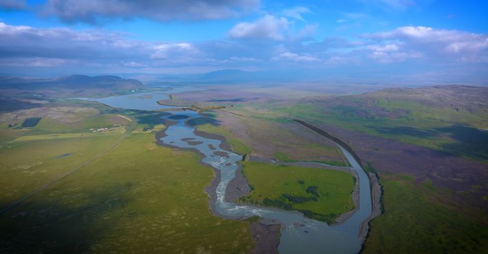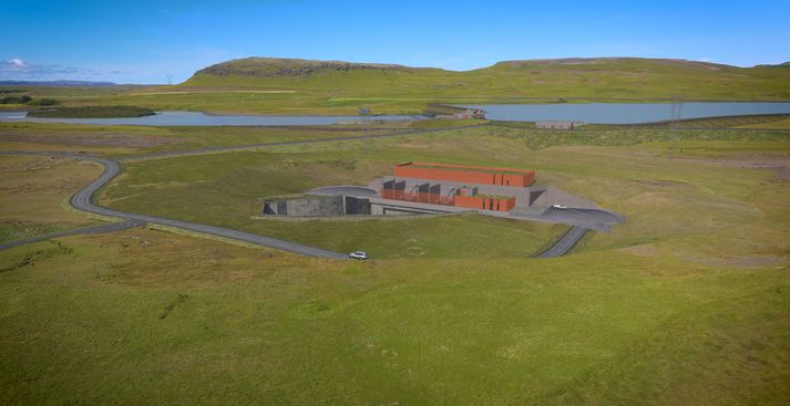 Fjallað var um verkefnið í kvöldfréttum Sýnar en Landsvirkjun hóf undirbúningsframkvæmdir vegna Hvammsvirkjunar í fyrra. Núna í sumar á að halda verkinu áfram með umfangsmikilli jarðvinnu. „Við höldum áfram að vinna í frárennslisskurði og hefjum mokstur fyrir stöðvarhúsi, inntaki og flóðgáttum,“ segir Guðbjartur Jón Einarsson, verkefnastjóri Landsvirkjunar við Hvammsvirkjun. Svona mun stöðvarhús Hvammsvirkjunar líta út. Fjær sjást stíflan í Þjórsá og lónið sem myndast ofan hennar.Landsvirkjun Sex tilboð bárust, það lægsta sameiginlegt boð frá Fossvélum og Suðurverki upp á 896 milljónir króna, sem var einungis 64% af 1.405 milljóna króna kostnaðaráætlun. Verksamningur var undirritaður í höfuðstöðvum Landsvirkjunar í dag en verktakarnir teljast báðir Sunnlendingar. „Já, það er mjög ánægjulegt að fá nágranna okkar í þetta verkefni. Fossvélar voru með okkur í fyrri samningi á síðasta ári og við hlökkum til áframhaldandi samstarfs með þeim og Suðurverki,“ segir Guðbjartur í sjónvarpsfréttinni sem sjá má hér með viðtali við káta Sunnlendinga: Dofri Eysteinsson, eigandi Suðurverks, er Rangæingur og Jón Örn Ingileifsson, eigandi Fossvéla, er Árnesingur. Við spurðum hvort það væri ekki vel við hæfi að Sunnlendingar taki þetta verk í ljósi þess að athafnasvæðið er beggja vegna við Þjórsá. „Jú, jú, þetta er svona táknrænt sko,“ svarar Jón Örn. „Já, já, þetta er gott,“ svarar Dofri. Stíflan, inntakslónið og stöðvarhúsið.Landsvirkjun Og segja báðir að verkið leggist vel í þá. Kærumálum vegna Hvammsvirkjunar er þó ekki lokið. „Það er, eftir því ég best veit, ein kæra núna í gangi vegna virkjunarleyfisins,“ segir Guðbjartur hjá Landsvirkjun en kveðst þó bjartsýnn á að hægt verði að bjóða út stærstu verkþættina síðar á árinu. „Bara í besta falli öðru hvoru megin við sumarfrí.“ Frárennslisskurðurinn til hægri.Landsvirkjun Og verktakarnir voru leystir út með listaverki frá Koggu með þessum orðum verkefnastjóra Landsvirkjunar: „Þetta egg á að tákna þetta samstarf okkar. Við erum að vinna saman í náttúrunni og þurfum að fara vel með hana. Eggið er náttúrulega bara brothætt en samt sterkt. Það er svona merki um okkar samstarf.“ Guðbjartur Jón Einarsson, verkefnastjóri við Hvammsvirkjun, afhenti fulltrúum verktakanna egg sem táknræna gjöf um brothætta en sterka náttúruna.Sigurjón Ólason Dofri Eysteinsson er einn mesti reynslubolti verktakageirans, orðinn 78 ára gamall. Honum líst vel á samstarfið við Árnesinginn. „Þetta bara á að geta gengið vel hjá okkur Jóni. Við höfum báðir trú á hvor öðrum til þessa verks. Og ég er ekki í neinum vafa með það. Þetta flýtur vel undan okkur. Og okkar mönnum,“ sagði Dofri. -Þér finnst gott að vinna með svona öldungum? „Já, já, í fylgd með fullorðnum,“ svarar Jón Örn. „Já, já. Maður eldist aldrei í þessu,“ segir Dofri. Fulltrúar Landsvirkjunar, Fossvéla og Suðurverks stilltu sér upp fyrir hópmyndatöku að lokinni undirritun verksamnings.Sigurjón Ólason