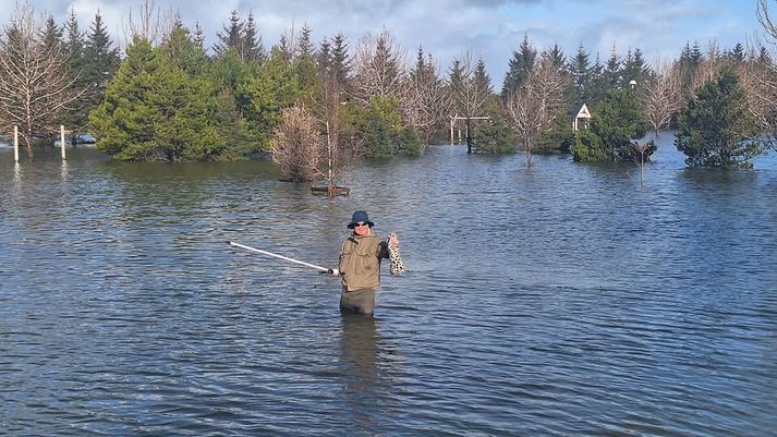 Guðmundarlundur á bólakafi Freyja Þórisdóttir skrifar 10. apríl 2026 13:14 Kristinn H. Þorsteinsson, framkvæmdastjóri Skógræktarfélags Kópavogs, segir gleðina við völd í Guðmundarlundi nú sem endra nær. Skógræktarfélag Kópavogs Útivistarsvæðið Guðmundarlundur í Kópavogi minnir frekar á stöðuvatn en útivistarsvæði eftir storma og tilheyrandi leysingar. Framkvæmdarstjóri Skógræktarfélags Kópavogs segir vatnshæðina hafa náð tæplega metra þegar mest var. Allt horfi til betri vegar og skipulagðar fermingarveislur um helgina fari fram. Kristinn H. Þorsteinsson, framkvæmdastjóri Skógræktarfélags Kópavogs, segir að ekki hafi skapast álíka ástand síðan árið 2019. Það þurfi þó enginn að hafa áhyggjur enda sé unnið alveg á fullu við það að létta á vatninu. „Við erum umvafin snillingum hérna og það eru allir tilbúnir að bjarga þessu með okkur,“ segir Kristinn í samtali við fréttastofu Vísis og bætir við að starfsmenn Kópavogs séu búnir að standa sig ótrúlega vel við að aðstoða félagið. Kristinn H. Þorsteinsson, framkvæmdastjóri Skógræktarfélags Kópavogs, stillti sér upp í miðju vatninu. Skógræktarfélags Kópavogs Að sögn Kristins er ástandið tilkomið vegna vatns sem seytlar niður úr nærliggjandi hlíðum enda liggur Guðmundarlundur í dal. Hann lýsir því hvernig tvær stórar vinnuvélar séu nýttar í aðgerðunum og að þær grafi eins konar skurði sem hleypa þannig vatni úr lundinum. Fermingarveislur haldnar um helgina Kristinn segir að enginn þurfi að hafa áhyggjur af ástandinu og að þeir sem eigi salinn í lundinum bókaðan fyrir fermingarveislur um helgina geti andað rólega. „Það er unnið alveg á fullu að því að létta á vatninu enda eru fermingar í húsinu um helgina, þannig að við ætlum að klára þetta í dag. Það geta verið allt að 150 þúsund manns sem heimsækja svæðið á mánuði og því er þetta vatn ekki kærkomið,“ segir Kristinn. Hann segir að svæðinu hafi verið lokað í vikunni og að veginum upp í lundinn hafi verið lokað neðan við hesthúsin á svæðinu. Kristinn segir að vatnshæðin hafi náð allt að áttatíu sentímetrum á köflum. „Við settum keilu hérna við veginn en það var svo reyndar einhver vitleysingur sem tók sig til í morgun, færði hana og keyrði út í skurð,“ segir Kristinn en hann segir svo frá því að grafa sem var á svæðinu hafi verið nýtt til að draga bílinn upp á veg aftur. Veiðistöng og snorklgríma að heiman „En þó að allt hafi í raun farið alveg á kaf er ekkert að gera nema að slá á létta strengi. Þessi snorklgríma og veiðistöng komu að heiman en fiskurinn er svo bangsi sem ég fékk að láni frá barnabarninu mínu,“ segir Kristinn. Í færslum á Facebook-síðu félagsins hafa verið auglýst bæði grunnnámskeið í köfun í lundinum og opnun veiðsvæðis en Kristinn segir að um léttvægt grín sé að ræða. Færslurnar tvær sem Skógræktarfélag Kópavogs birti á Facebook-síðu sinni eru hér að neðan. Fyrri færslan hljóðar svo: Opnun veiðisvæðis í Guðmundarlundi hófst vel. Fyrsti fiskur vorsins var 3,5 punda hangur af tegundinni golfuggabassi (Salmo golfuggius) og var landaður í mini-golfholu. Það er allt morandi af fiski í Guðmundarlundi og allir eru velkomnir — veiðin er ókeypis. Eitt skilyrði er þó að gæta góðrar umgengni við vatnið. Mikilvægt er að skrá fjölda fiska, tegundir og þyngd afla; skráning og veiðiskýrslur skulu skilaðar að lokinni veiðiferð. En sú seinni svona: Grunnnámskeið í köfun var haldið í Guðmundarlundi í gær. Sérstakt próf þarf að standast til að mega kafa í Guðmundarvatni í Guðmundarlundi. Bóklegi hlutinn fór fram í salnum á Leiðarenda 3 þar sem farið var yfir helstu áhættuþætti, nauðsynlega þekkingu og viðbrögð ef fólk drukknaði. Nemendur fengu lánaðan allan búnað sem þarf fyrir námskeiðið. Sömu kröfur gilda um þurrbúningsréttindi til að fá að kafa í Guðmundarlundi og tíðkast víða þar sem kafað er í mjög köldu vatni. Á myndinni er kennari námskeiðsins að undirbúa köfun; allir 20 nemendur námskeiðsins eru hins vegar þegar undir yfirborði og sjást því ekki. Í dag verður framhaldsnámskeið í djúpköfun með vasaljósi ef nægjanleg þátttaka fæst. Kópavogur Veður Mest lesið Lifandi maður sagður látinn í Morgunblaðinu Innlent Segir Stefán hafa gert atlögu að friðhelgi einkalífs Innlent Fletti upp í LÖKE vegna meintrar fíkniefnaskuldar vandamanns Innlent Kona handtekin vegna dánartilkynningar í Morgunblaðinu Innlent Hriktir í stoðum MAGA: Trump ævareiður vegna gagnrýni stuðningsmanna sinna Erlent Bílar bíta grasið við bakka Vesturbæjarlaugar Innlent Guðmundarlundur á bólakafi Innlent Bein útsending: Kynna atvinnustefnu og aðgerðir gegn verðbólgu Innlent Norlandair mátti ekki bjóða í Ísafjörð á þessari flugvél Innlent Sömdu um starfslok bæjarstjóra Akraness Innlent Fleiri fréttir Krefjast þess að framkvæmdir við Kaffistofuna verði stöðvaðar Bein útsending: Kynna áform um endurreisn Grindavíkur Guðmundarlundur á bólakafi Kona handtekin vegna dánartilkynningar í Morgunblaðinu Sömdu um starfslok bæjarstjóra Akraness Muni ekki fallast á tilmæli til barnafjölskyldna í Grindavík „Ný atvinnustefna Íslands markar tímamót“ Valkyrjurnar boða aðgerðir til að takast á við verðbólguna Nýtt framboð í Reykjavík á elleftu stundu Segir Stefán hafa gert atlögu að friðhelgi einkalífs Fjölmiðlahugtakið sagt útþynnt og gagnslaust Bein útsending: Kynna atvinnustefnu og aðgerðir gegn verðbólgu „Að mínu mati lýsir þessi dómur ekki réttlæti“ Helmingur hefur áhyggjur af áróðursherferðum erlendra ríkja Kom fyrir hlerunarbúnaði en var sýknaður: „Úr