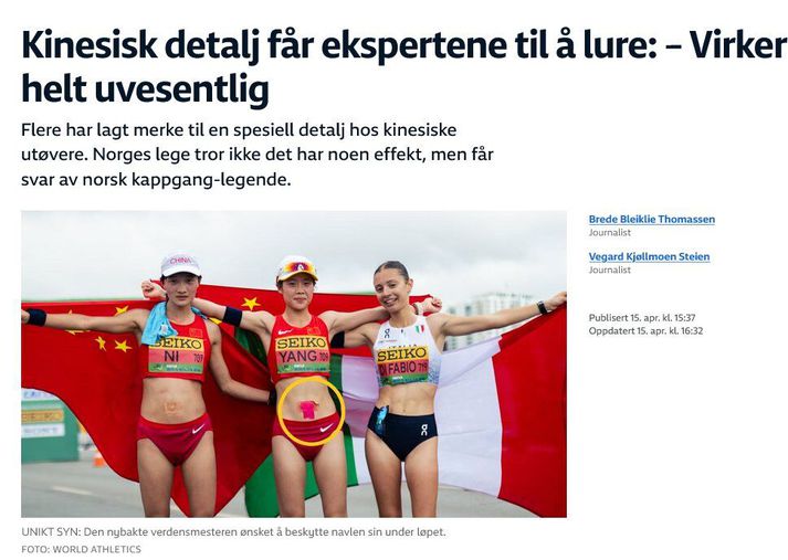 Sigurmyndirnar frá verðlaunapalli sunnudagsins í 10 kílómetra kappgöngu kvenna vöktu nefnilega viðbrögð og spurningar í frjálsíþróttaheiminum. Þegar gullverðlaunahafinn Yang Yutong og bronsverðlaunahafinn Ni Lihua stilltu sér upp með kínverska fánann voru þær báðar með plástur á maganum. Umfjöllun norska ríkisútvarpsins. NRK Sport Sömu plástrar huldu naflann meðan á allri 10 kílómetra keppninni stóð. Hvers vegna? spurðu margir sig. Sumir höfðu sínar kenningar. „Það virðist sem þeir vilji vernda naflann, þar sem það er svæði með lítilli fitu í kring. Það er til kínversk kenning um að það geti komið í veg fyrir krampa, magavandamál og kulda,“ sagði frjálsíþróttasérfræðingurinn Vebjørn Rodal við norska ríkisútvarpið. Læknir norska frjálsíþróttalandsliðsins, Ove Talsnes, telur ekki að þetta bragð geti haft nein læknisfræðileg áhrif. Hann og hans eigin frjálsíþróttamenn vilja heldur ekki prófa neitt nýtt sem hefur ekki sannaða virkni samkvæmt vísindum. „Ég veit ekki til þess að það hafi nein áhrif til að koma í veg fyrir sýkingar að plástra naflann. En við sjáum jú reglulega að slíkar hugmyndir koma upp,“ sagði Talsnes við NRK. Ein besta kappgöngukona Noregs fyrr og síðar, Kjersti Tysse Plätzer, bendir á að kappgöngumenn fái oft magavandamál í keppnum þar sem búkurinn snýst mikið. Þess vegna er mikilvægt að tryggja að maginn verði ekki fyrir neinni truflun. Tysse Plätzer segir að kínverska bragðið sé ekkert nýtt. Hún veit ekki hvort það sé eingöngu til að gefa lyfleysuáhrif en sumir hafa velt fyrir sér hvort að það gæti verið eitthvað slíkt í gangi. „Ég get ekki tjáð mig um það, en að þeir noti eitthvað sem hefur áhrif á búkvöðvana í kappgöngu er alveg eðlilegt,“ sagði Tysse Plätzer við NRK. View this post on Instagram A post shared by World Athletics (@worldathletics)