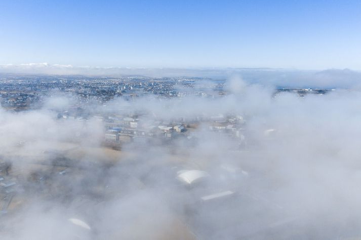 Margt býr í þokunni en að þessu sinni helst leifar af fok­sandi sem fauk út í hafs­auga eftir að hafa mengað loftið yfir höfuð­borgar­svæðinu á sunnu­daginn en snýr nú aftur vestan úr hafi og liggur þungt yfir Reykja­vík og nágrenni.