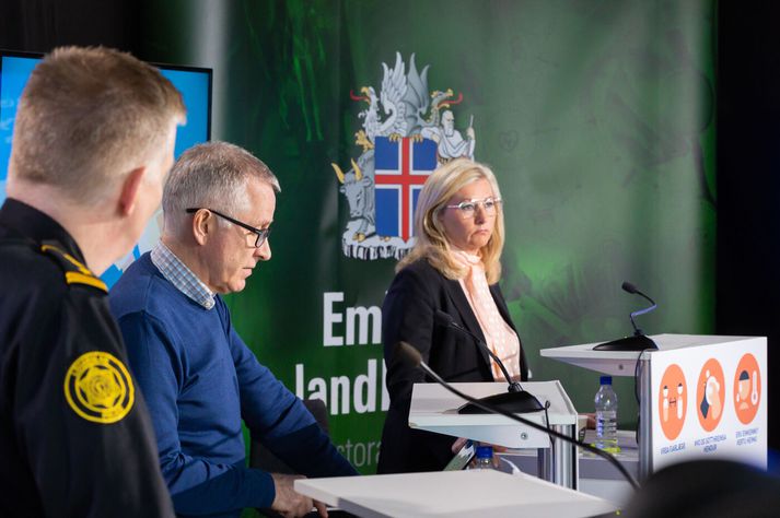Alma Möller, þá landlæknir, ásamt Víði Reynissyni, þá sviðsstjóra Almannavarna og nú þingmanni Samfylkingarinnar, og Þórólfi Guðnasyni fyrrverandi sóttvarnalækni á einum af fjölmörgum upplýsingafundum Almannavarna í kórónuveirufaraldrinum.Vísir/Vilhelm