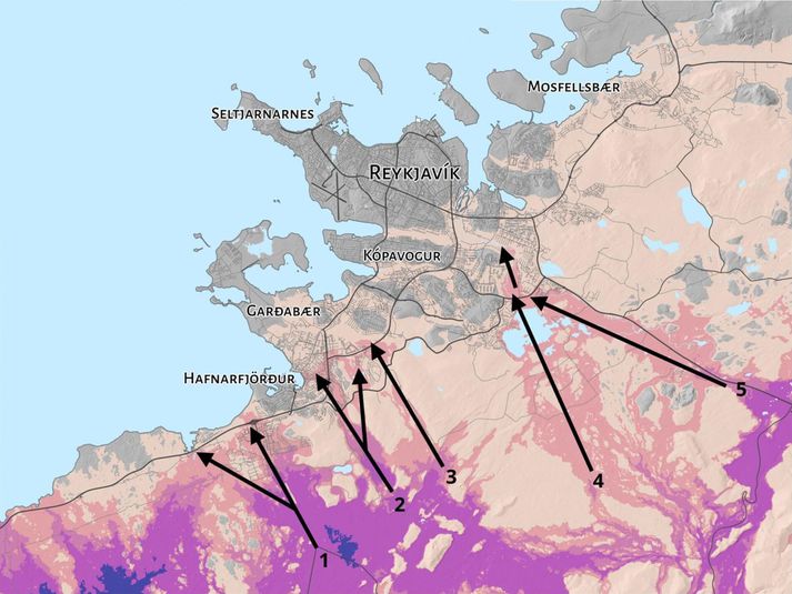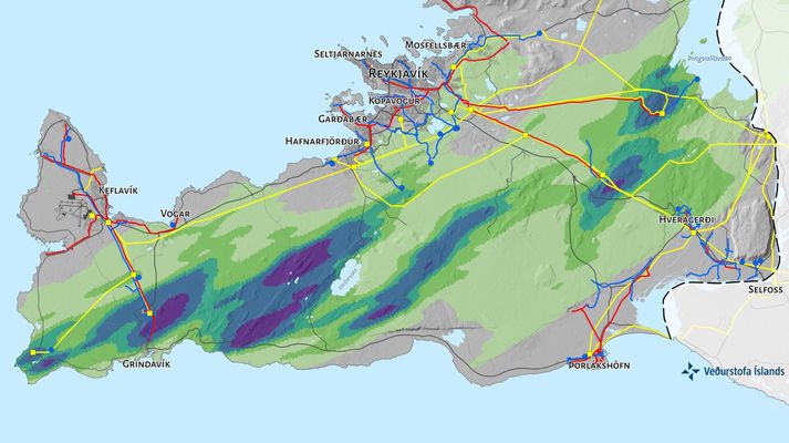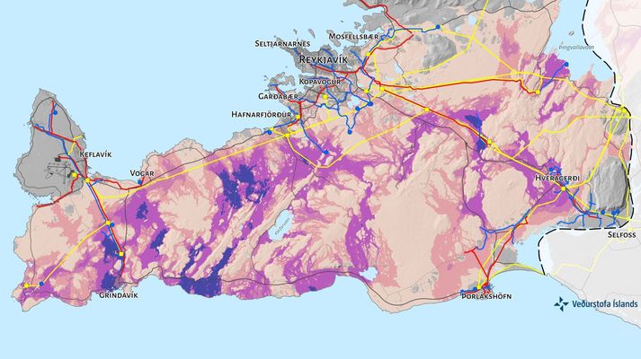 Í kvöldfréttum Sýnar er rætt við veðurstofustjóra og rýnt í kort Veðurstofunnar um líkur á gosupptökum. Á því sést að Grindavík er eini þéttbýlisstaðurinn með miklar líkur á gosopnun. Hins vegar eru fjórar mikilvægar virkjanir inni á skilgreindum eldgosasvæðum; Reykjanesvirkjun, Svartsengi, Hellisheiðarvirkjun og Nesjavallavirkjun. Mestar líkur á gosupptökum á Reykjanesskaga. Litir tákna mismiklar líkur, frá gráu upp í fjólublátt.Veðurstofan Annað kort sýnir líkur á hraunflæði miðað við meðalstór hraun. Reynsla er þegar fengin frá Grindavík og Svartsengi. En vert er að taka eftir öðrum svæðum á kortinu eins og Vogum, Hvassahrauni, Hafnarfirði og Hengilssvæðinu, bæði við Hveradali og á Nesjavöllum. Veðurstofan skilgreinir þrjá þéttbýlisstaði sem eru í mestri hættu á að fá hraunrennsli yfir byggð. Það eru Grindavík, hluti Hafnarfjarðar en einnig Hveragerði, sökum þess að hraun frá eldstöðvum í Henglinum og Hrómundartindi eru talin geta runnið niður í Ölfus, eins og lýst er hér í sjónvarpsfrétt Sýnar: En kannski góðu fréttirnar eru þær að fyrir utan hluta Hafnarfjarðar er meginhluti höfuðborgarsvæðisins talinn í mjög lítilli hættu. Það eru þó sýndar fimm líklegar hraunrennslisleiðir í átt að Hafnarfirði og Garðabæ og niður Elliðaárdal. Eldgosin við Grindavík leiddu til þess að Veðurstofunni var fyrir tveimur árum falið af ráðherra að vinna langtímaáhættumat vegna jarðskjálfta, eldgosa og annarrar jarðvár á Reykjanesskaga. Skýrslurnar tvær sem birtar voru í dag bera heitin Hraunvá á Reykjanesskaga og Hraunvá á höfuðborgarsvæðinu. Fimm líklegustu hraunrennslisleiðir í átt að byggðinni á Reykjavíkursvæðinu.Veðurstofan Hildigunnur H. H. Thorsteinsson veðurstofustjóri segir að með þeim sé þó hvorki verið að spá því hvar næst muni gjósa né hvenær. „Við erum ekki að segja að þetta sé gos sem komi á morgun eða á næsta ári. Við erum að gera okkur undirbúin fyrir að við séum á gosskeiði á þessum skaga. Það getur þýtt gos á næstu áratugum á einhverju af þessum svæðum og við þurfum að vera tilbúin þegar það gerist.“ Dökkblár og fjólublár litur tákna mestar líkur á hraunflæði á Reykjanesskaga fyrir meðalstór hraun. Á myndinni má sjá lífæðar samfélaga á svæðinu, það er helstu raflínur, vatnslagnir fyrir heitt og kalt vatn og vegi.Veðurstofan Hildigunnur segir að í raun komi fátt á óvart í skýrslunum. „Þetta eru allt staðir sem við höfum talað um áður. Við höfum byggt á hrauni áður, höfum skipulagt svæði nálægt hraunbreiðum, þannig að það eru svæðin sem að við erum að benda á aftur núna.“ Horft úr Vallahverfi í Hafnarfirði til mögulegra eldgosasvæða.Vísir Skýrslunum er ætlað að gagnast meðal annars við skipulagningu byggða. „Og svo líka að horfa á þannig að við séum tilbúin þegar váin steðjar að. Eða eru einhverjar mótvægisaðgerðir sem við viljum undirbúa? Erum við með flóttaleiðir eða rýmingaráætlanir rétt skipulagðar? Ég veit að þetta er starf sem er nú þegar hafið í almannavarnanefndum á svæðinu,“ segir veðurstofustjóri. Skýrslan tekur einnig á mikilvægum innviðum, eins og vegum og virkjunum. Séð til Hengils frá Þingvallavatni. Nesjavallavirkjun í krikanum til vinstri.Einar Árnason. „Það eru svo sem fjórar virkjanir á svæðinu sem eru á háhitasvæðum. Það er ástæða fyrir að við erum með jarðhitavirkjanirnar þar sem þær eru. En við þurfum að skoða hvernig gerum við þær öruggari. Og sömuleiðis með þéttbýlin sem liggja annaðhvort nálægt gosupptökum eða hraun getur flætt inn á. Við þurfum að skoða hvernig við ætlum að takast á við vána ef hún steðjar að okkur,“ segir Hildigunnur.